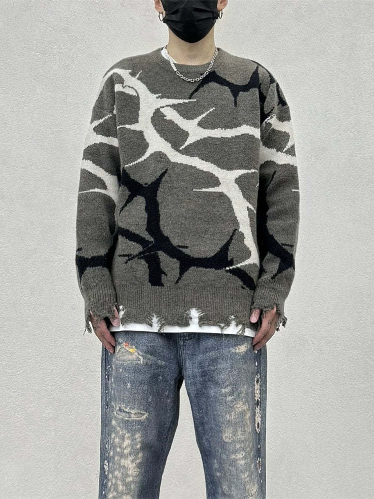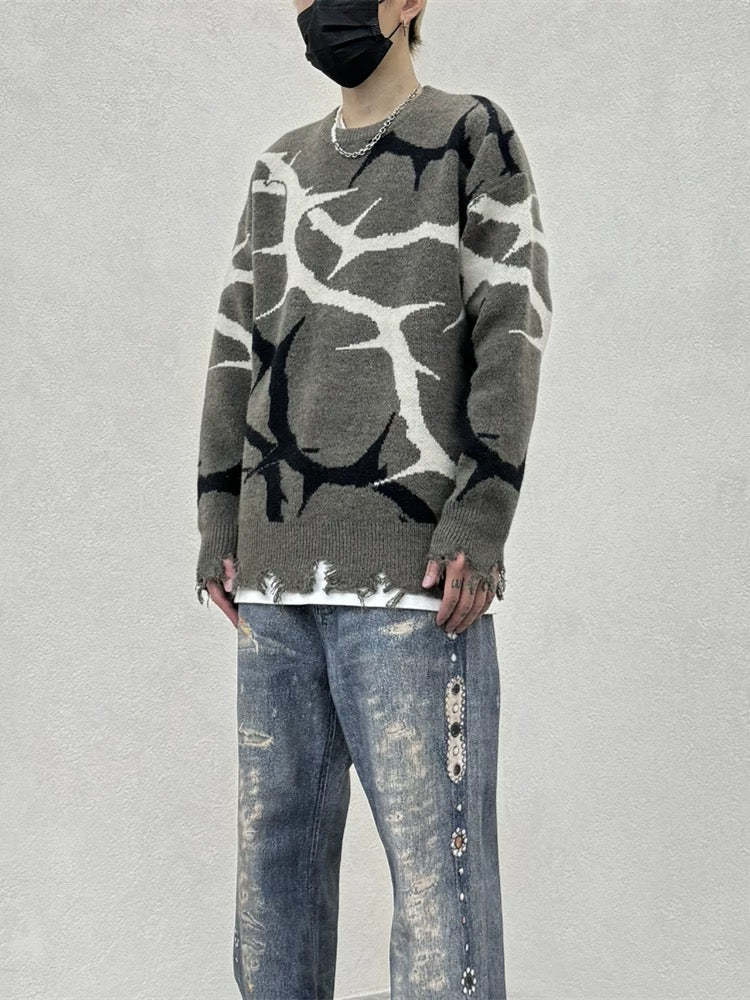 • Detail Features: Distressed Details, Crew Neck, Long Sleeves