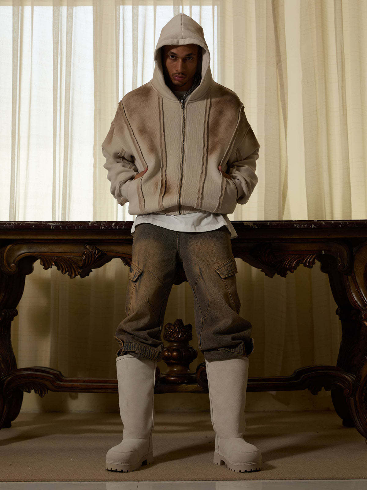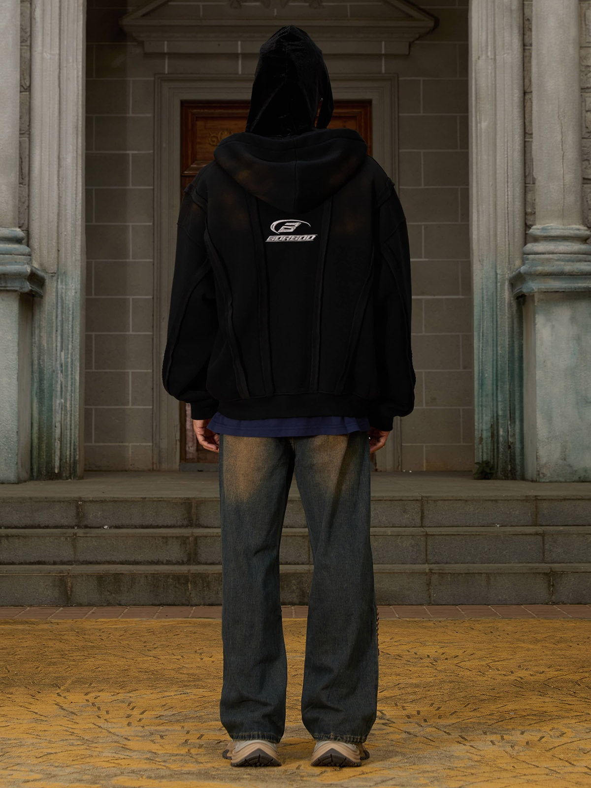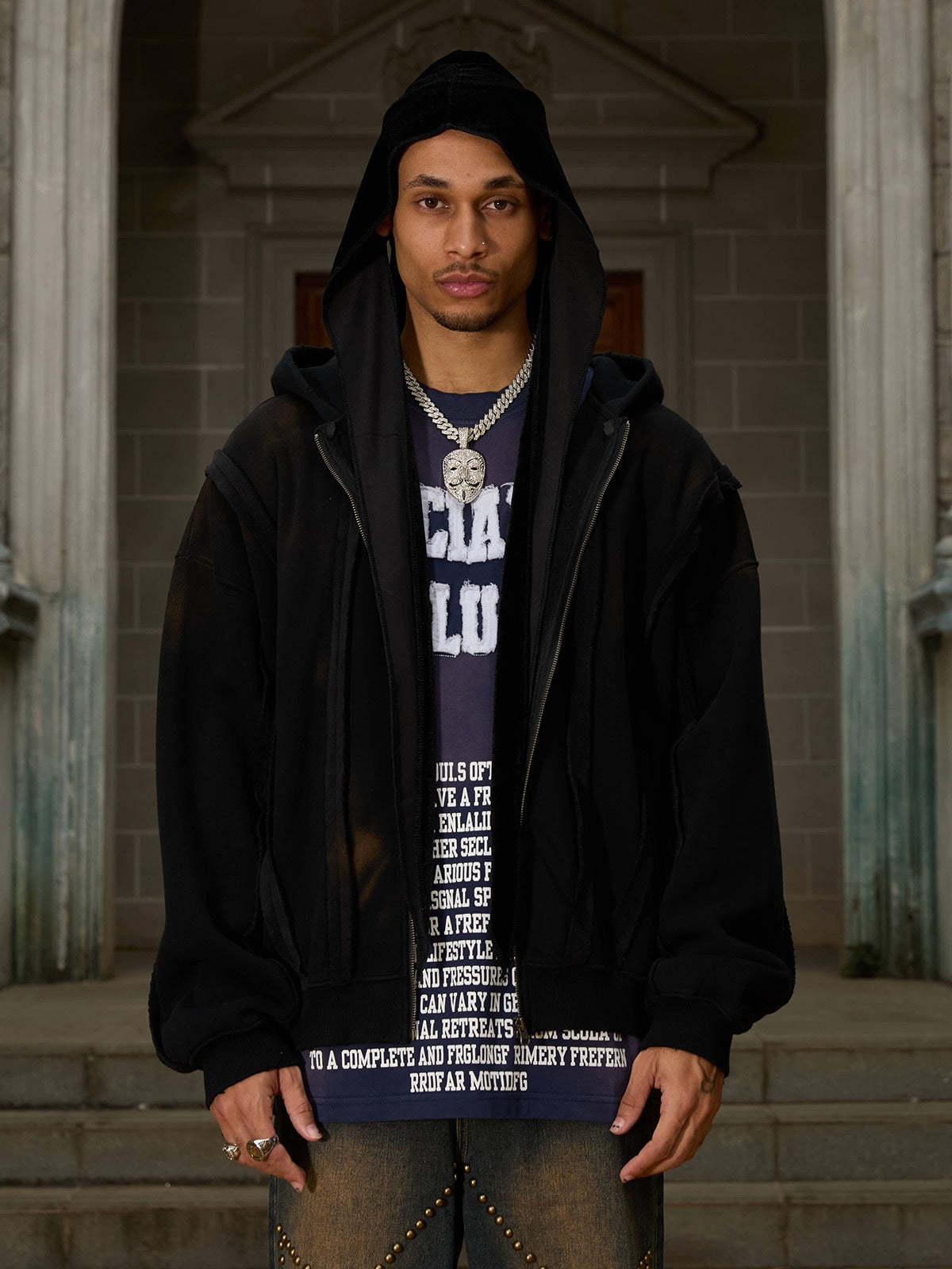 Thesupermade Distressed Patchwork Velvet Cardigan Hooded Sweatshirt