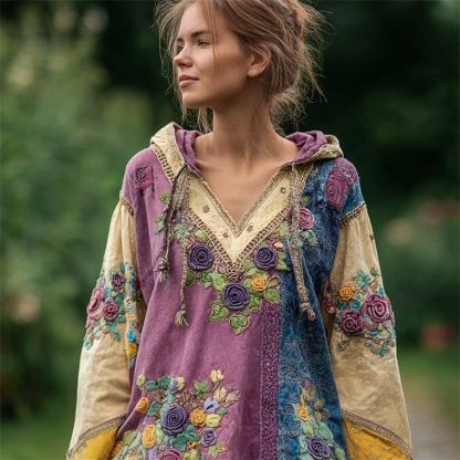 Boho Purple Roses Embroidered Colorblock Stitched Linen Hoodie