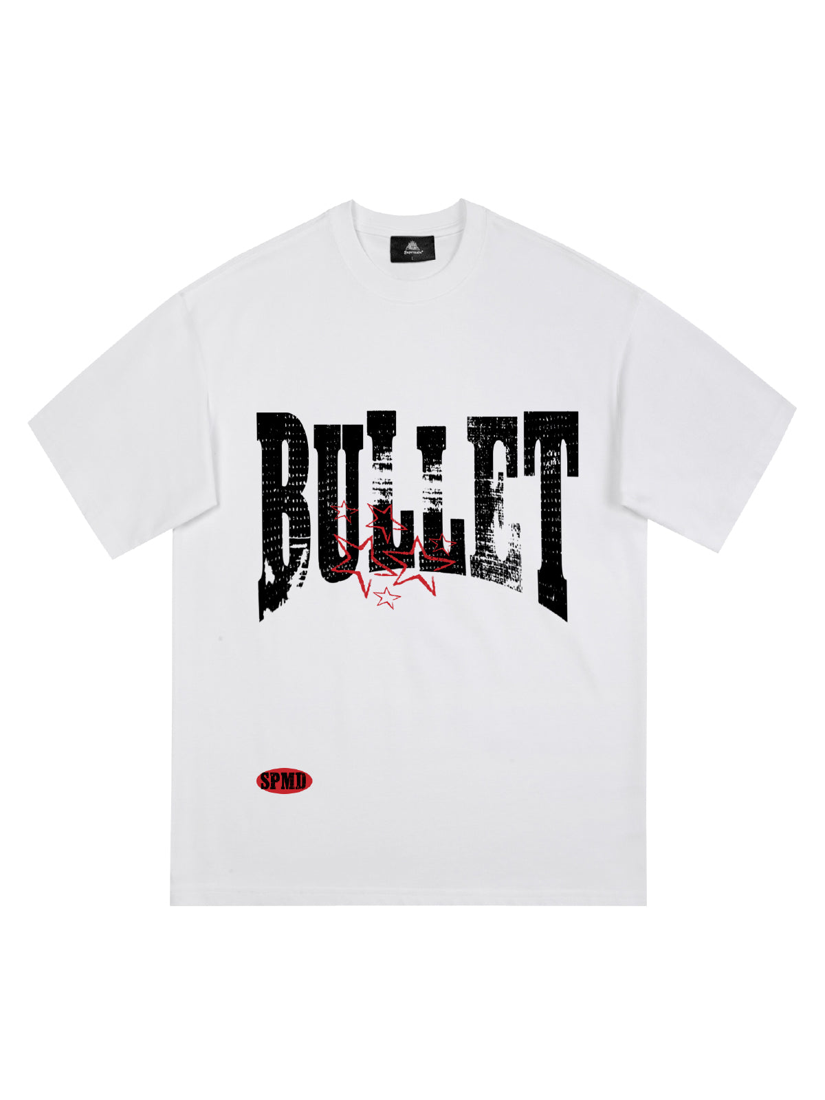 • Design Elements: Large graphic text with distressed effect, red star accents, small logo patch