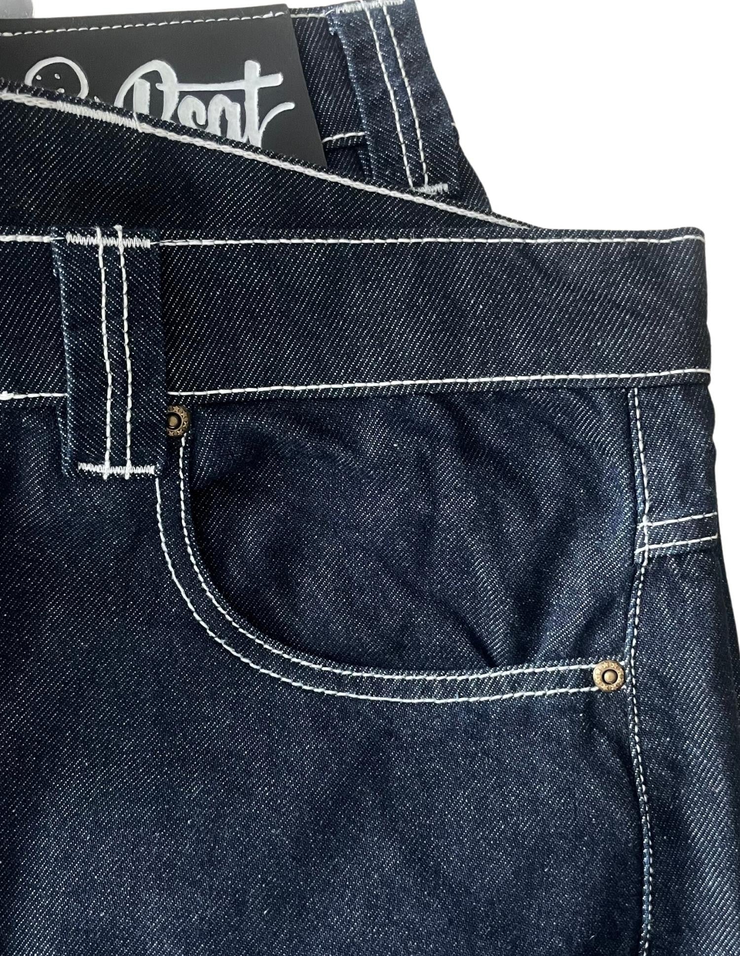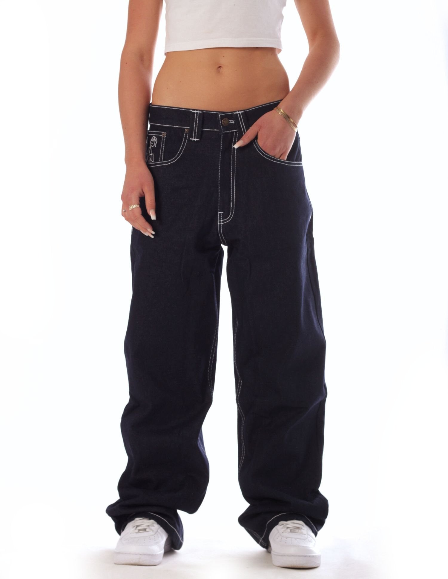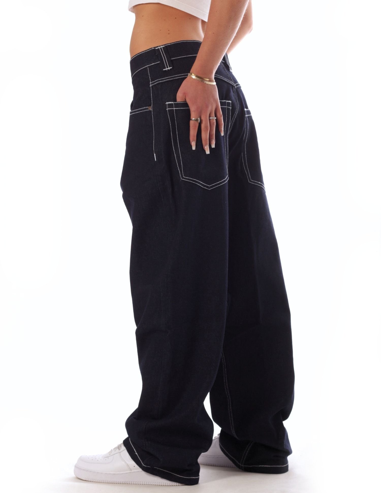 De coole Baggy Jeans er produceret i indigo blå, med brede bælte loops, der er tydeligt markerede med hvide syninger som alle andre syninger i øvrigt. Det giver buksen et ekstra sporty og urban look.