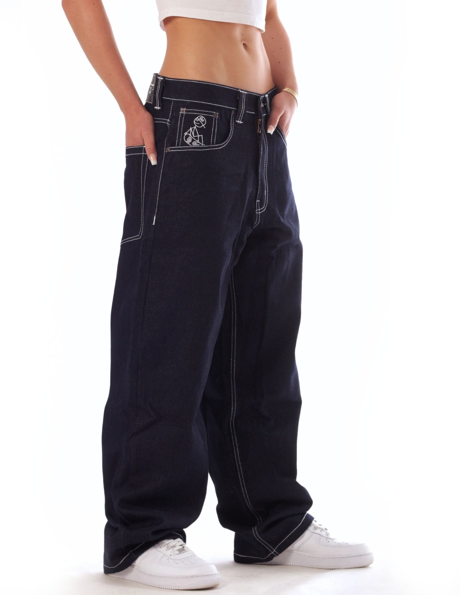 På Skater Baggy Jeans er møntlommen broderet med en rolling Skater figur. Bare giv den gas.