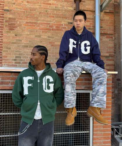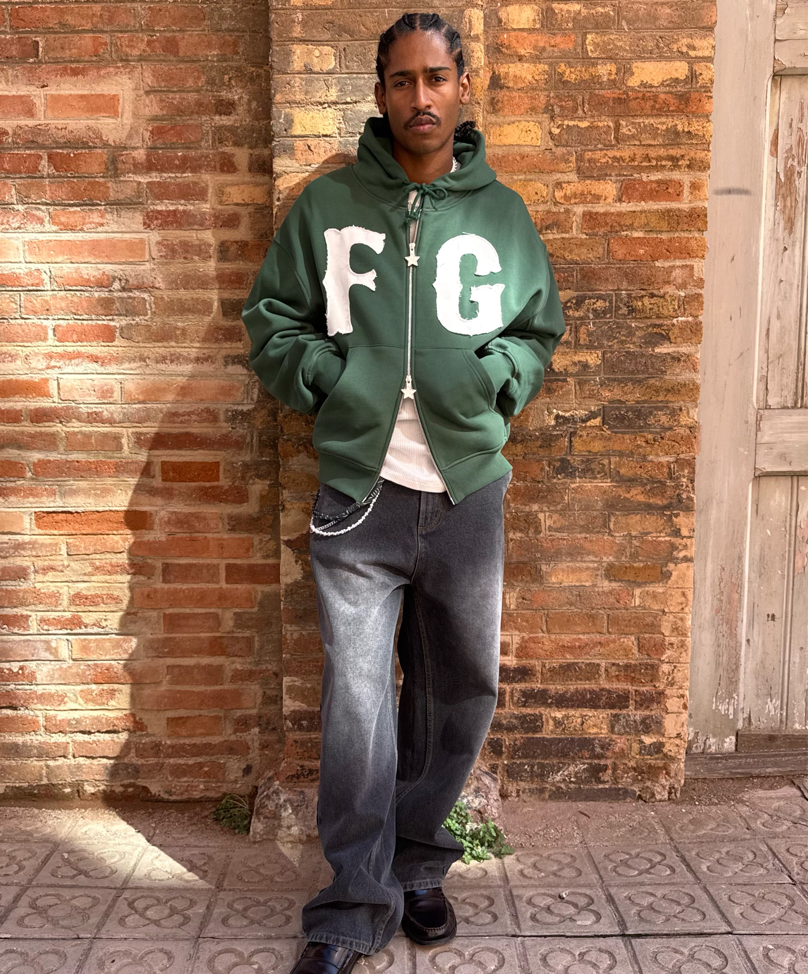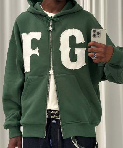 On the front, the initials FG stand out in a large, textured patch, adding character and a striking finish that won't go unnoticed. This distinctive detail gives it an exclusive look, ideal for those looking for garments that make a style statement.