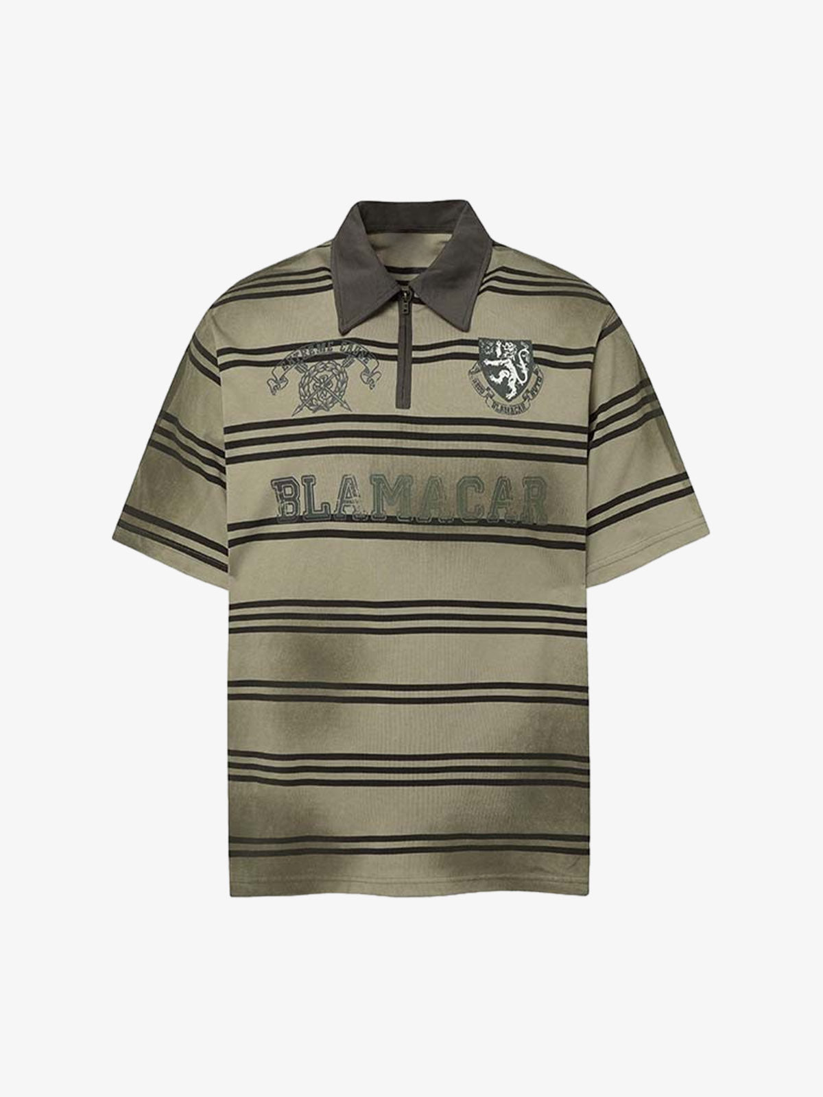 • Design Elements: Embroidered logo on chest, striped pattern, half-zip closure