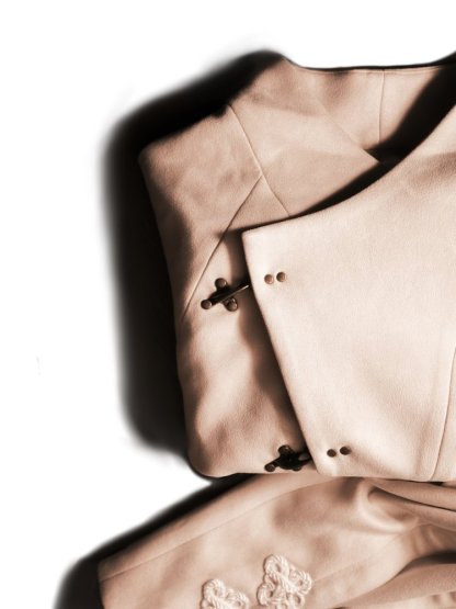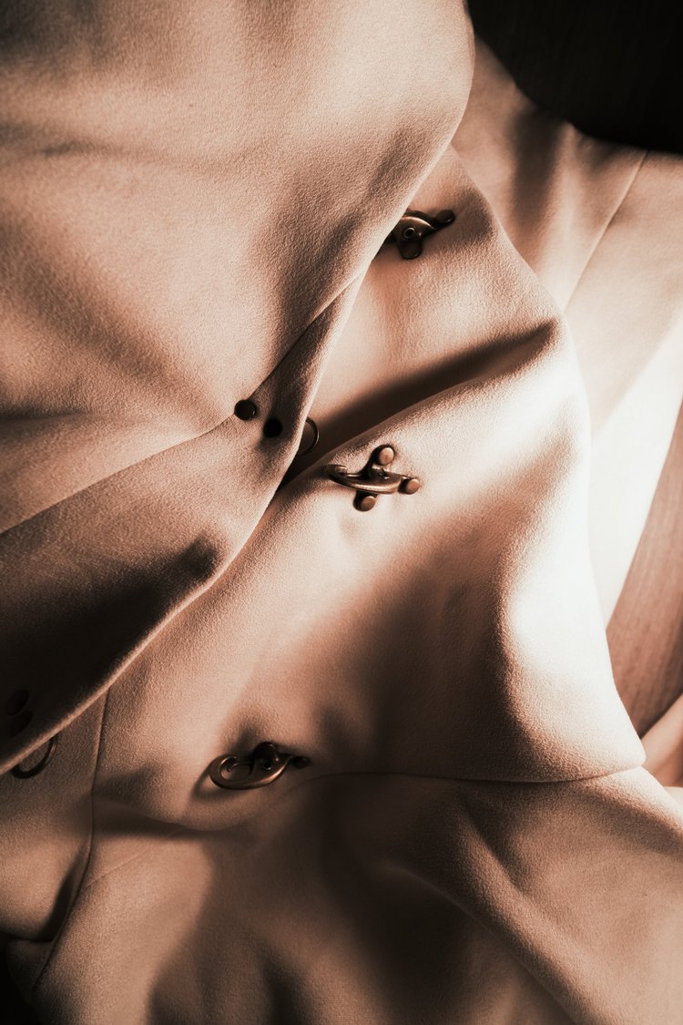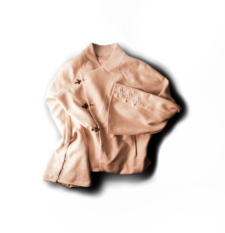 Jacket features hanfu inspired silhouette with detachable and retractable beige panel system. Asymmetric front closure with copper finished metal buckles and faux suede fabric to complete the piece. Conceived for all-season versatility, each element has been meticulously chosen to embody quiet luxury and endure form. A testament of our craftsmanship, and the art of elevated essentials.