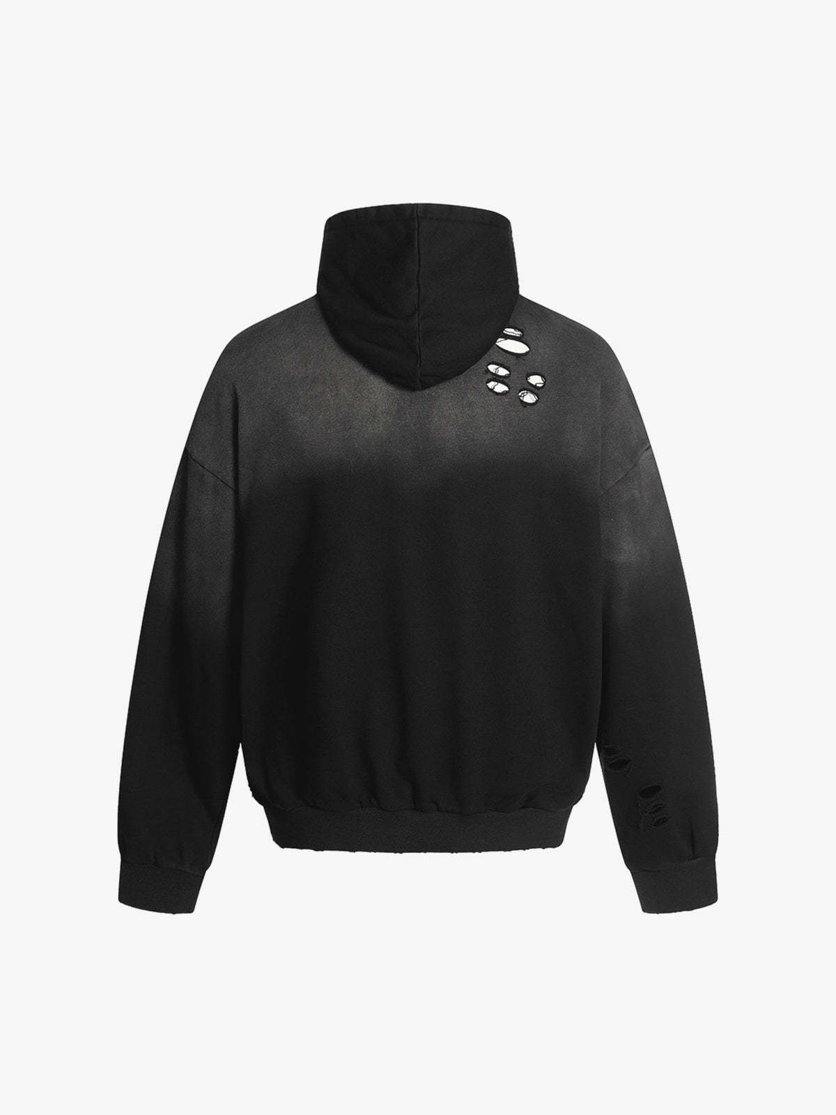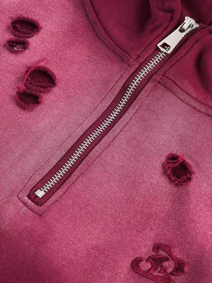 • Detail Features: Half-zip closure, front pocket, distressed cut-out details on shoulders and sleeves
