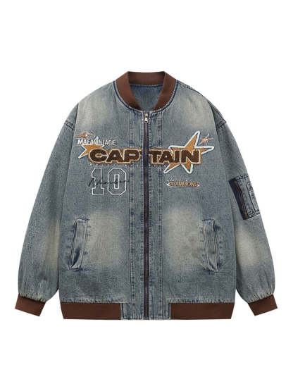 Thesupermade Alphabet Patch Embroidered Quilted Denim Bomber Jacket - 2311