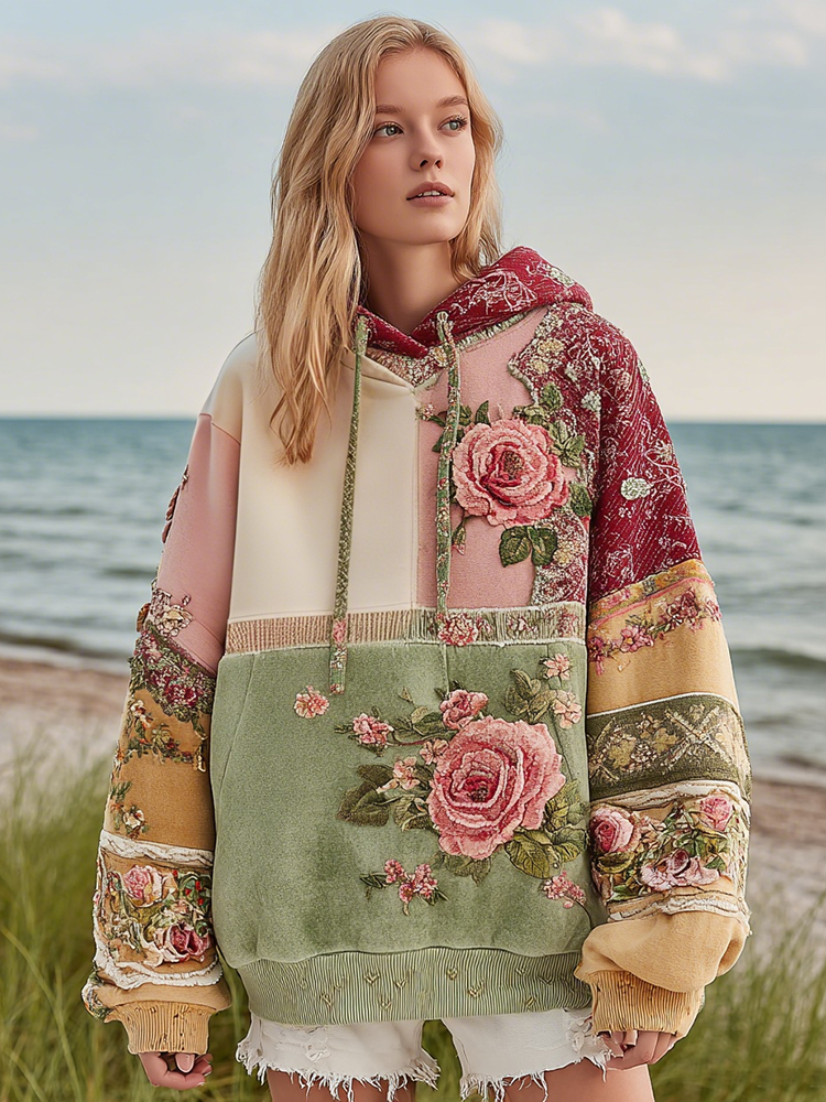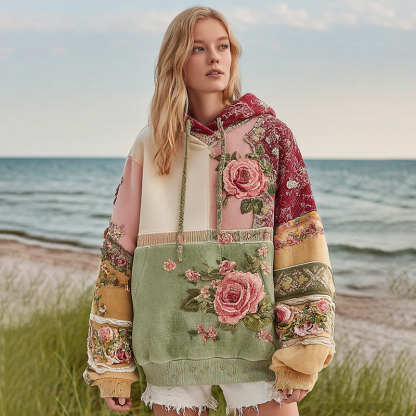 Women's Rose Floral Patchwork Cozy Warm Hoodie