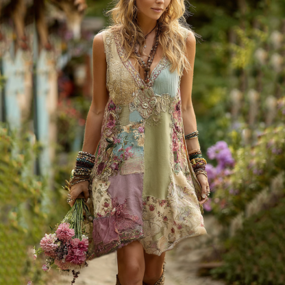 Women's Vintage Floral Splicing Cotton And Linen Tank Dress