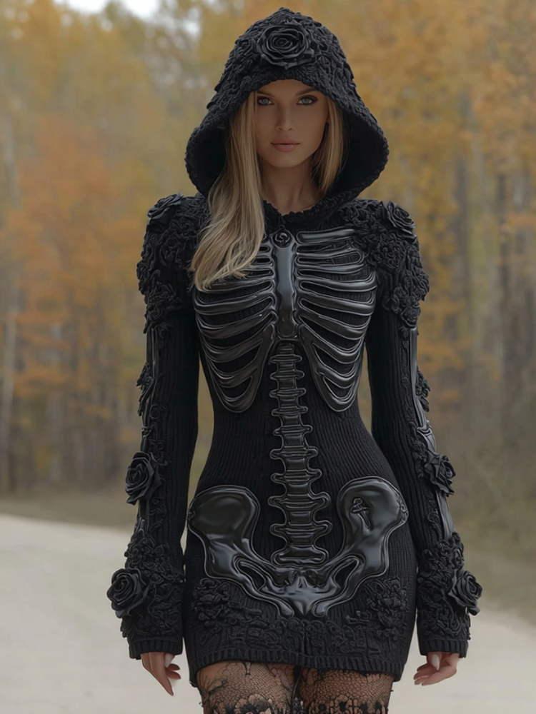 Women's Vintage Halloween Skeleton Bones Rose Lace Art Cozy Knit Hooded Sweater Dress